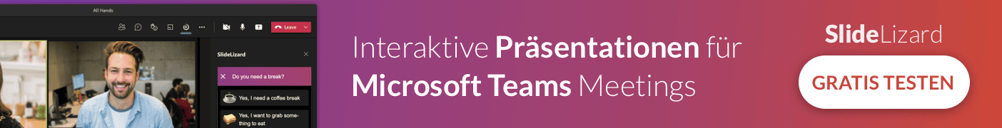 Die Einbindung von Umfragen in PowerPoint ist in den letzten Jahren immer beliebter geworden. Schließlich ist das Stellen von Fragen an das Publikum wahrscheinlich der älteste Trick im Buch, um das Publikum erfolgreich zu integrieren. Aber mit neuen Technologien können Sie nicht nur mehr einen der Teilnehmer auswählen, um Ihre Frage zu beantworten. Sie können interaktive Umfragen erstellen und jeden mit seinem Smartphone abstimmen lassen. Mit dem PowerPoint-Plugin SlideLizard können Sie beispielsweise Umfragen sowohl vor als auch während der Präsentation erstellen. Holen Sie die Meinung des Publikums ein und zeigen Sie ihm sofort die Ergebnisse. Unser Tipp, um das Engagement gleich zu Beginn zu steigern: Eisbrecher-Umfragen.